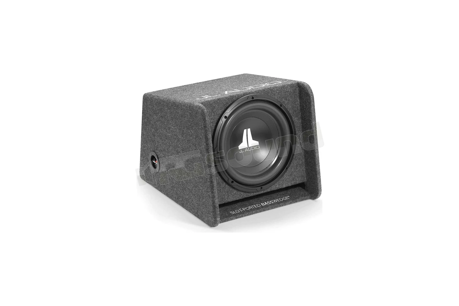 Finitura: moquette automobilistica di alta qualità, grigio scuro, con ricamo “JL AUDIO” sul bordo superiore e “Slot-Ported BassWedge” ricamato sull’imboccatura della porta.