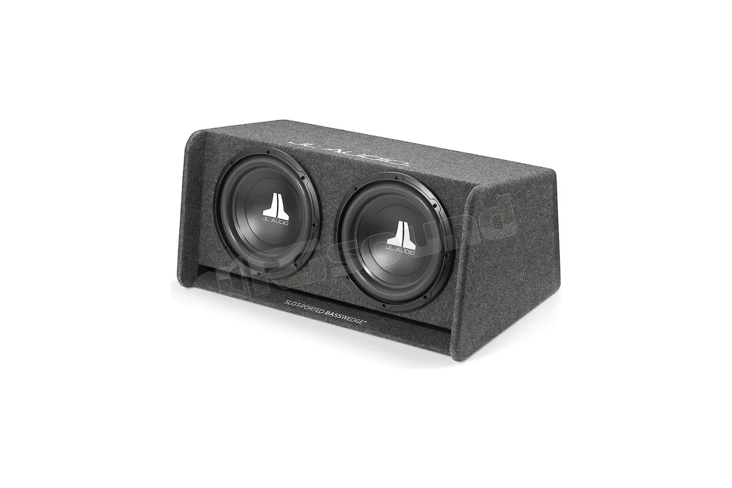 Finitura: moquette automobilistica di alta qualità, grigio scuro, con ricamo “JL AUDIO” sul bordo superiore e “Slot-Ported BassWedge” ricamato sull’imboccatura della porta.