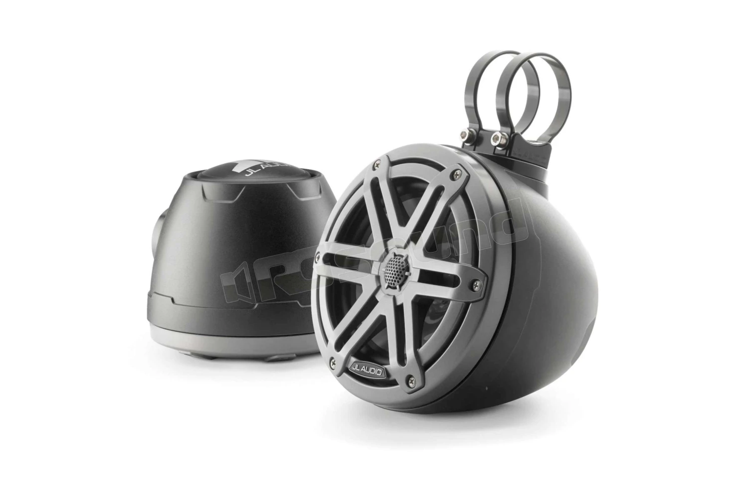 JL Audio M3-650VEX-Mb-S-Gm coppia di altoparlanti coassiali marini serie M3 da 6,5 pollici (60 W, 4 Ω), racchiusi in box sigillati con finitura nera opaca, griglia sportiva grigio metallizzato.