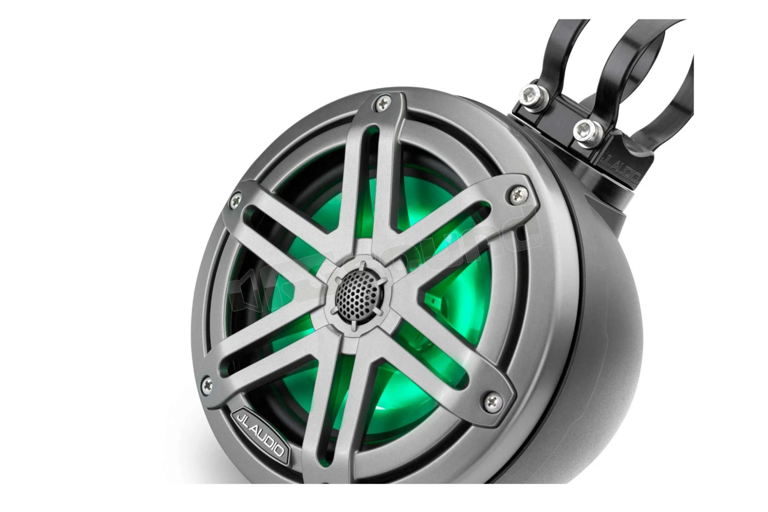 JL Audio M3-650VEX-Mb-S-Gm-i coppia di altoparlanti coassiali marini serie M3 da 6,5 pollici (60 W, 4 Ω), racchiusi in box sigillati con finitura nera opaca, griglia sportiva grigio metallizzato.