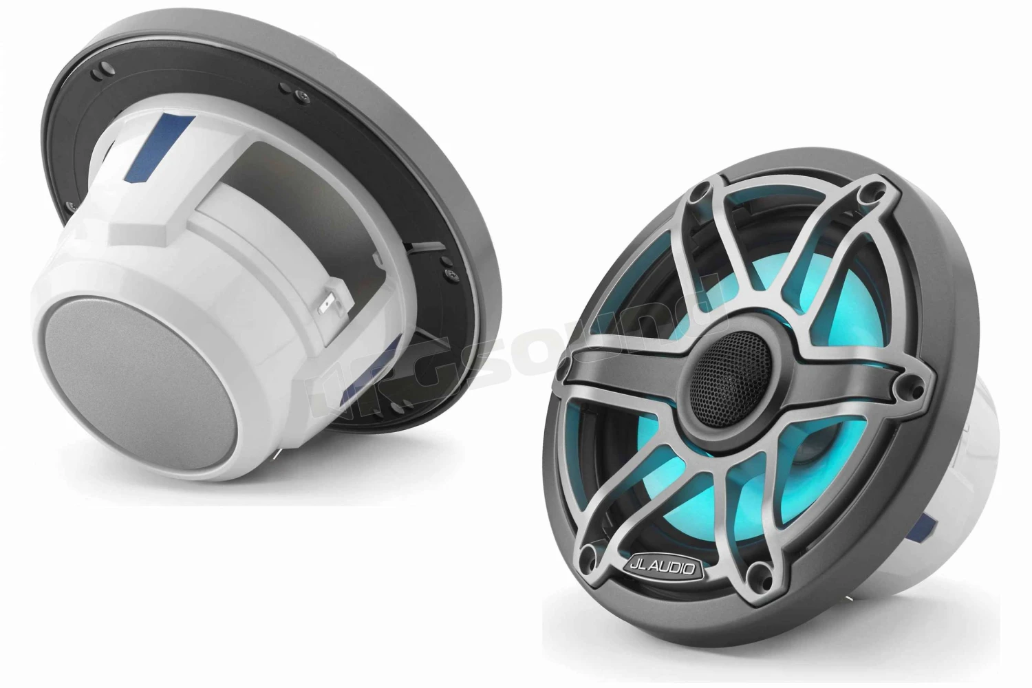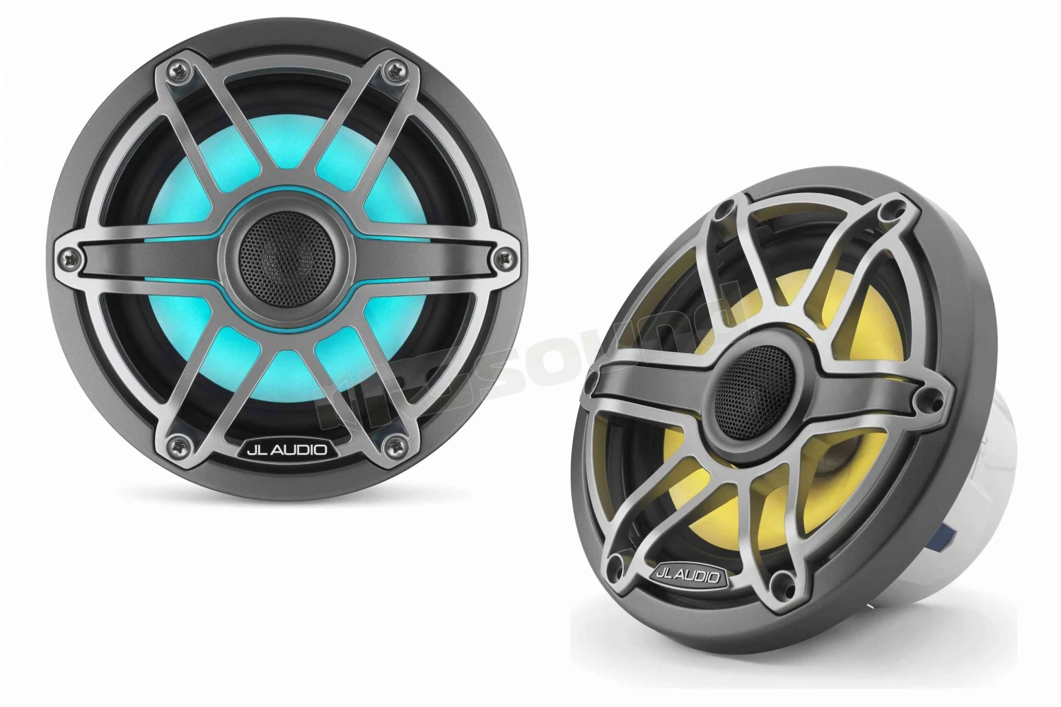 JL Audio M6-650X-S-GmTi-i coppia di altoparlanti coassiali nautici da 6,5 pollici (165 mm) con illuminazione a LED variabile, anello di regolazione e griglia sportiva con finitura titanio. Potenza nominale 75 W, impedenza 4 Ohm.