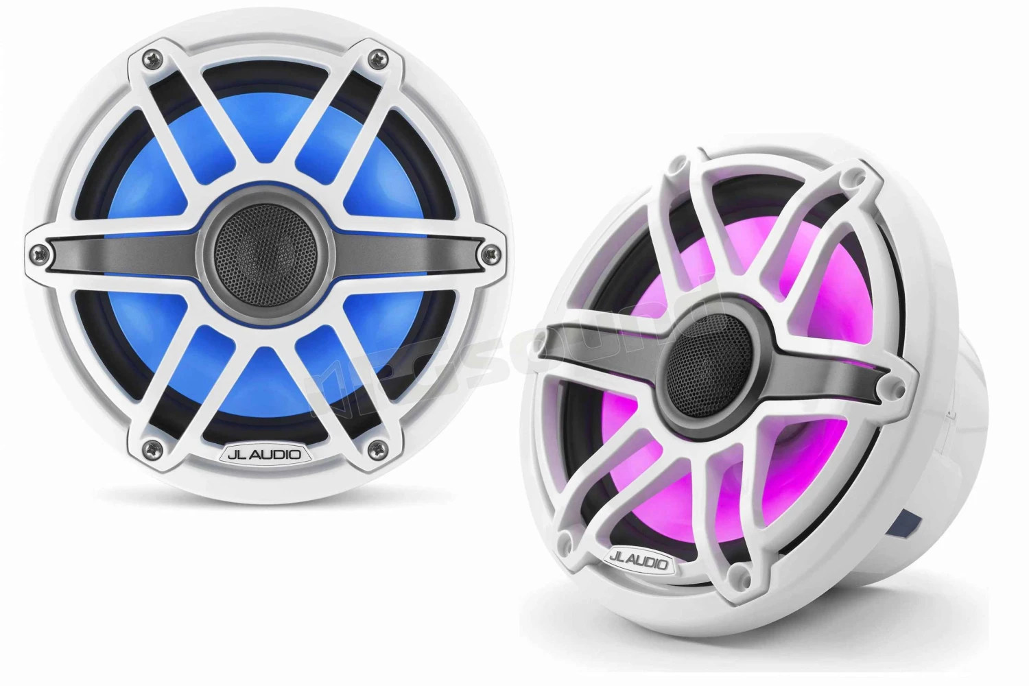 JL Audio M6-770X-S-GwGw-i coppia di altoparlanti coassiali nautici da 7,7 pollici (196 mm) con illuminazione a LED variabile, anello di regolazione e griglia sportiva con finitura bianco lucido. Potenza nominale 100 W, impedenza 4 Ohm.