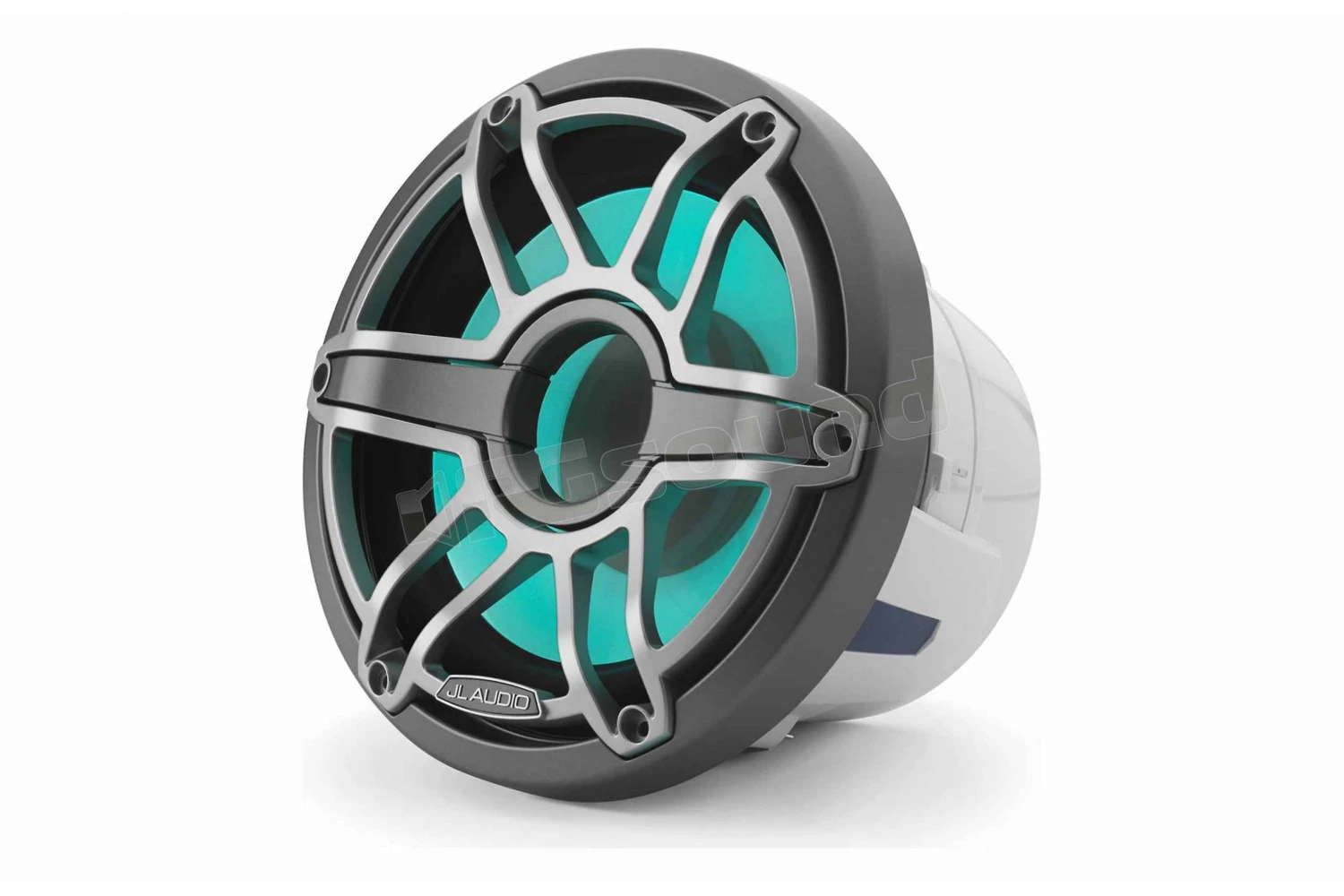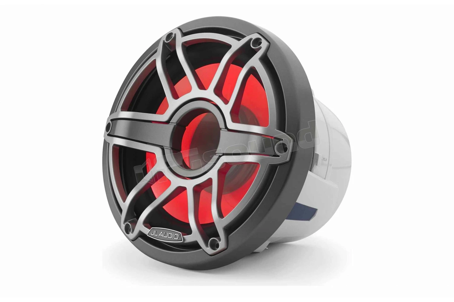 JL Audio M6-8IB-S-GmTi-i-4 subwoofer nautico 20cm con illuminazione a LED e griglia sportiva con look titanio. Impedenza 4 Ohm, potenza nominale 125 W, massima 200W.