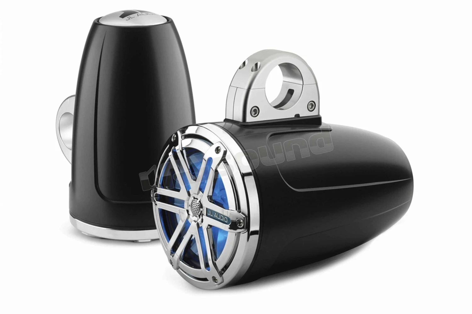JL Audio MX770-ETXv3-SG-CKLD-B coppia di altoparlanti coassiali in box adatti per la nautica, finitura esterna nero satinato, griglia sportiva cromata e cono del woofer illuminato da luce LED blu