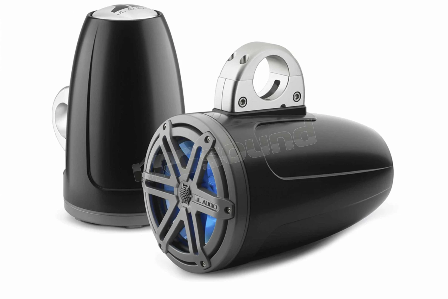 JL Audio MX770-ETXv3-SG-TKLD-B coppia di altoparlanti coassiali in box adatti per la nautica, finitura esterna nero satinato, griglia sportiva look titanio e cono del woofer illuminato da luce LED blu
