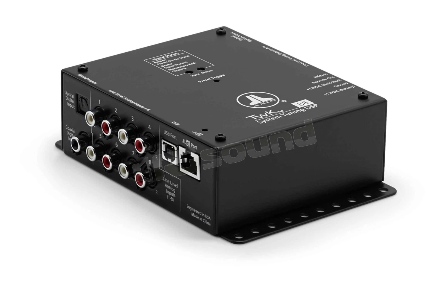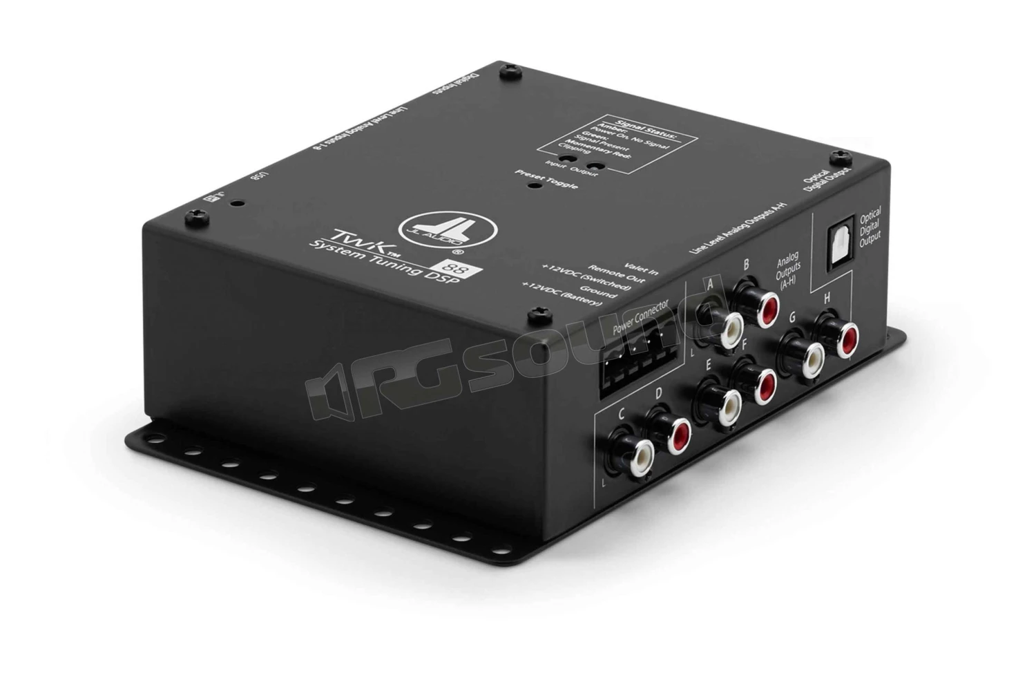 JL Audio TWK-88 sistema di sintonizzazione DSP con 8 canali in entrata: 4 ingressi RCA stereo, 2 ingressi digitali (ottici e coassiali) e 4 canali in uscita RCA stereo più 1 uscita ottica digitale.