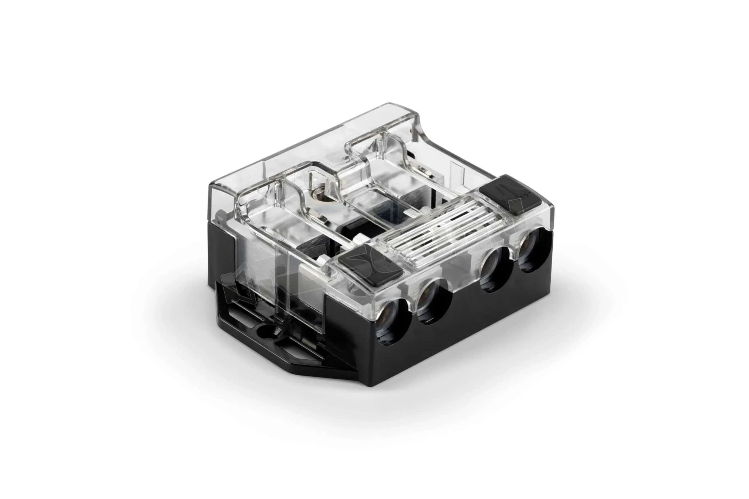 Progettato per dividere un filo grande fino a quattro fili più piccoli. L’ingresso di questo blocco accetta cavi da 1/0 a 4 AWG, mentre le quattro uscite con fusibili accettano cavi da 4 AWG a 8 AWG. Le prese OmniSert catturano fili di varie dimensioni senza la necessità di manicotti adattatori.